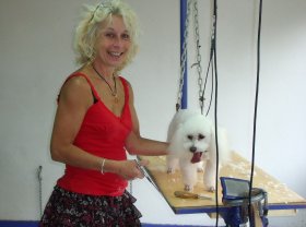 Pour cette étape, Anne Marie, la toiletteuse, s’occupe des soins des yeux, des oreilles (épilation et nettoyage), des dents et des griffes. Il faut aussi enlever le poil des coussinets, ceux situés au niveau du bas ventre et dégager ses fesses. Le bain